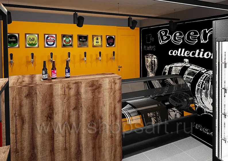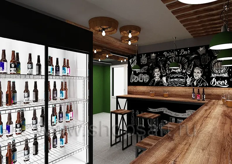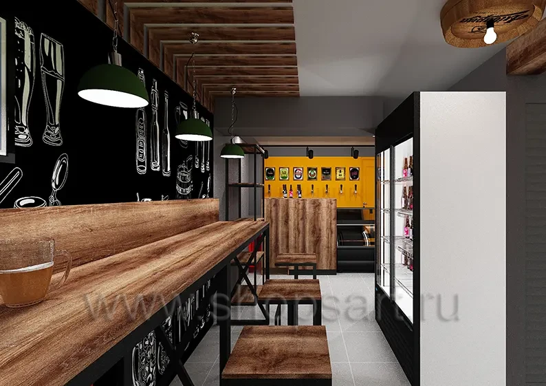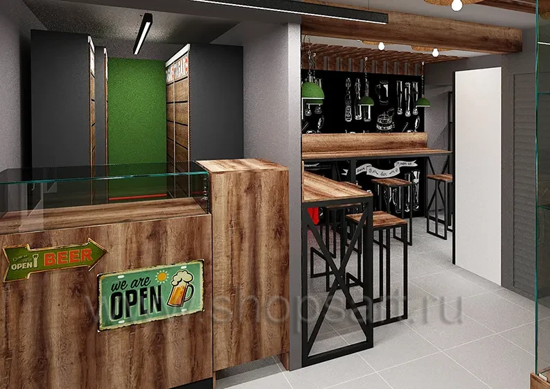 Проект строится вокруг чётких функциональных зон. Во входной группе предусмотрены холодильники с пивом по бокам. Барная стойка расположена вдоль фронтальной стены. Слева организована зона гостевых столов. Справа выделены «табачная» зона и зона сопутствующих аксессуаров. Санузел находится в дальнем правом углу. За барной стойкой предусмотрено помещение холодильник, где хранится продукция, чтобы персонал не «разрывал» сервис длинными перемещениями.