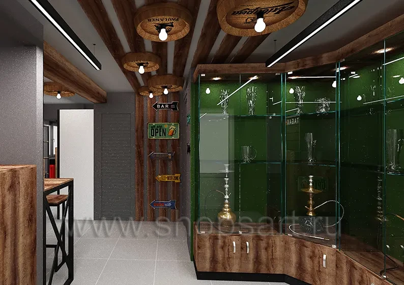 - Разделение мотивов посещения. Посадочная зона слева и тематические зоны справа (табак и аксессуары) позволяют развести разные интересы: кому нужен спокойный стол и разговор, а кому важны витрина и выбор. Так повышается «функциональная ёмкость» зала без ощущения перегруженности.