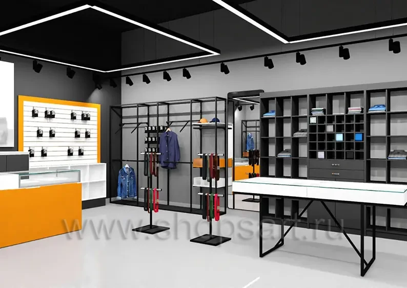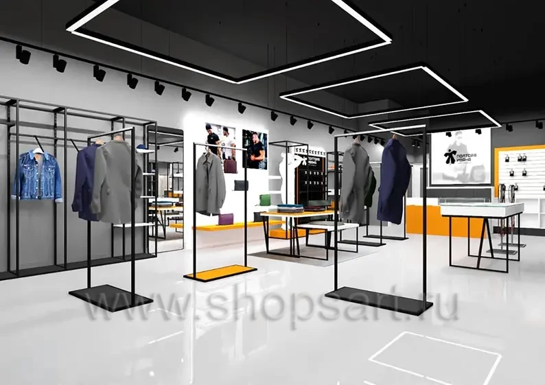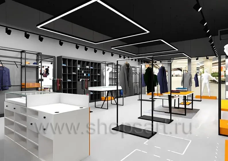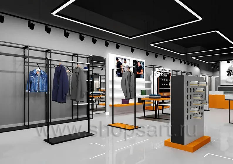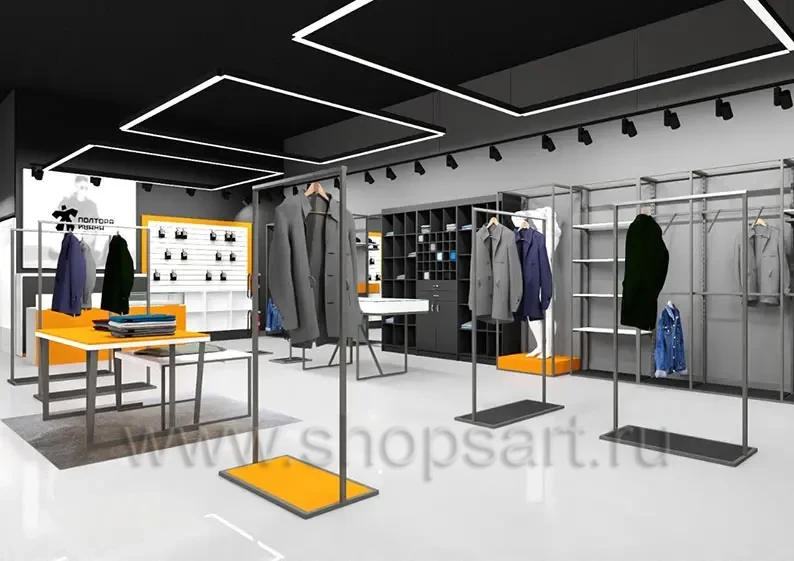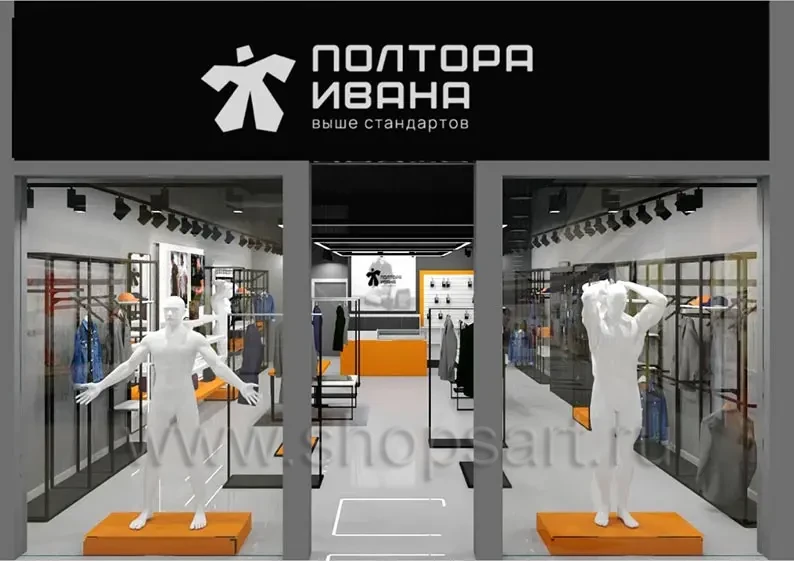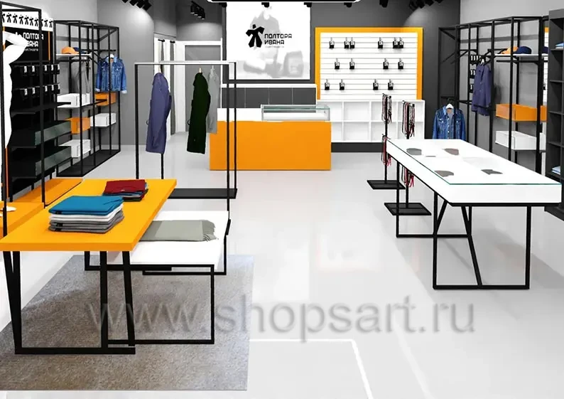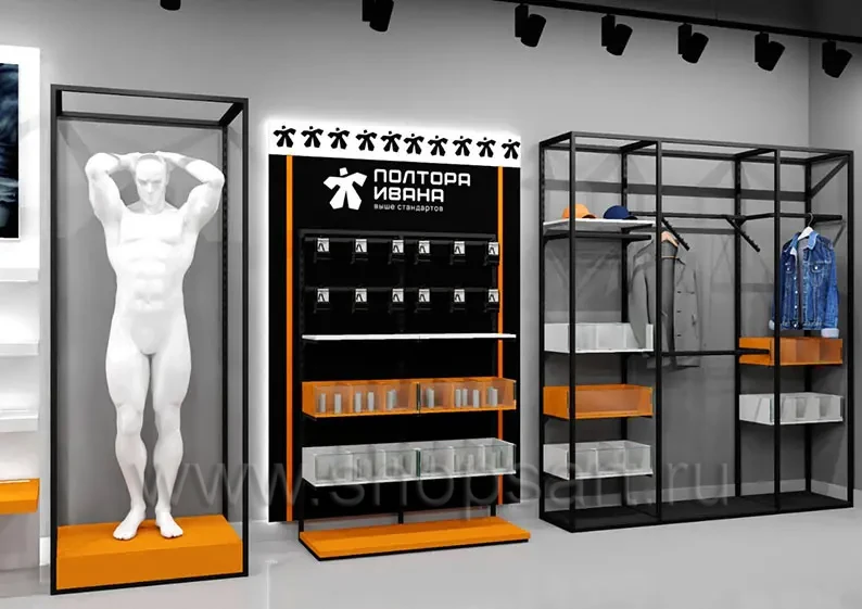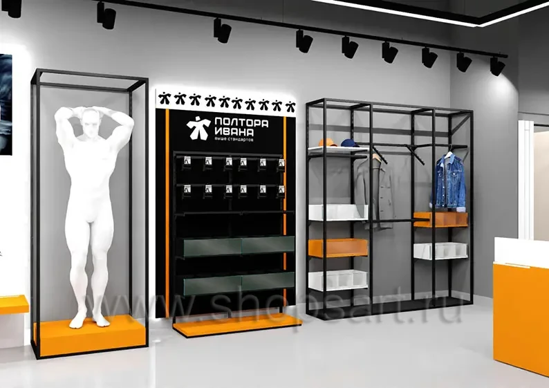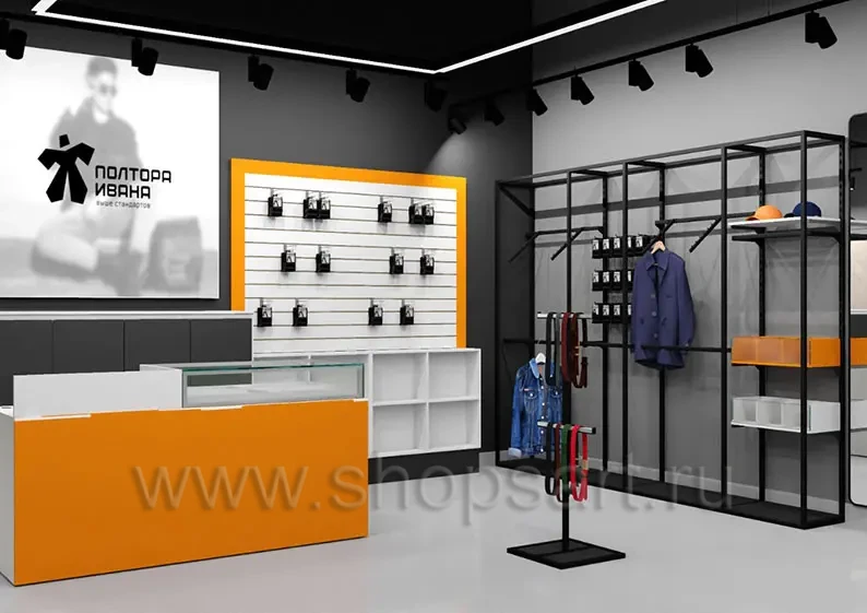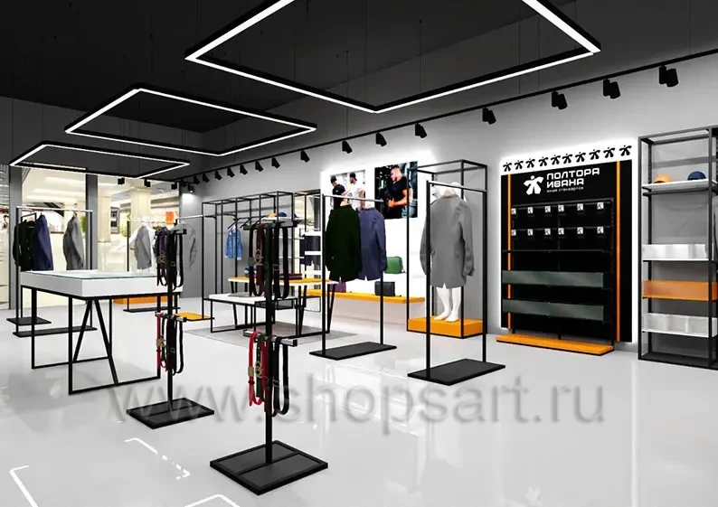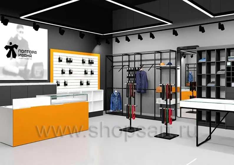 Дизайн интерьера магазина одежды Полтора Ивана коллекция торгового оборудования АТЛАНТ