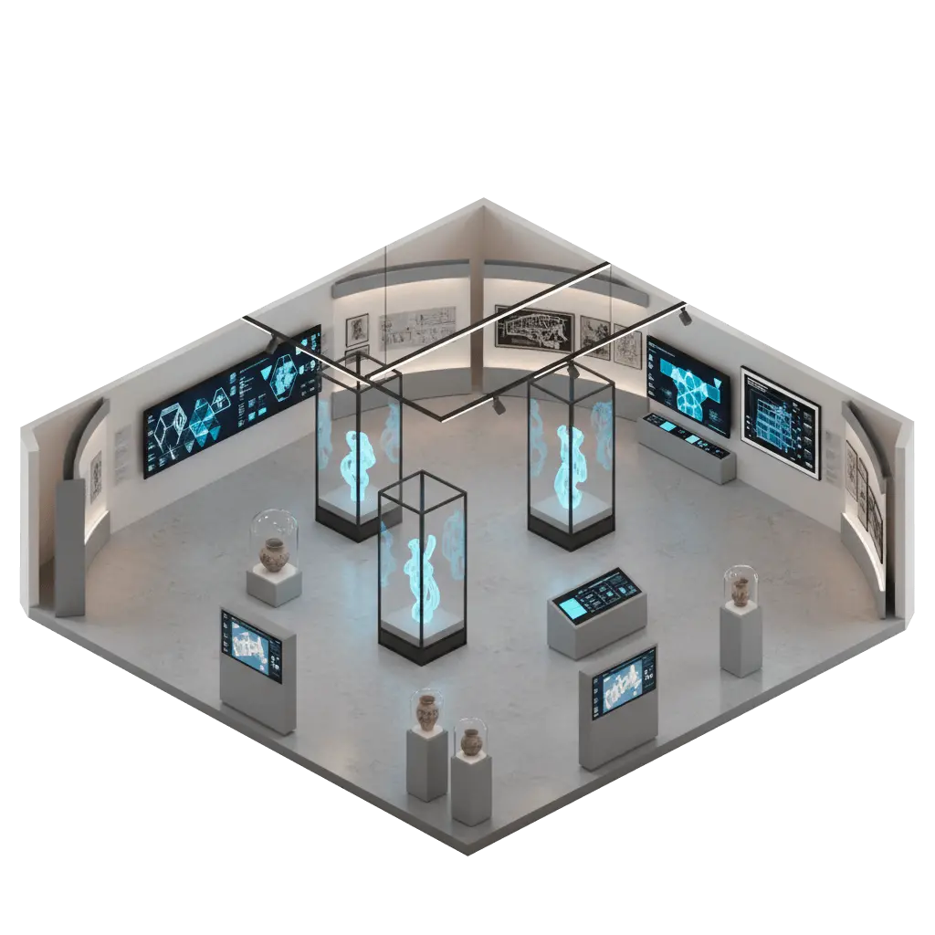 Расстановка производится с учётом всех архитектурных особенностей помещения, силами дипломированных специалистов на лицензионном программном обеспечении, которое позволяет в режиме реального времени, в вашем присутствии, оперативно вносить изменения в трёхмерную визуализацию вашего музея