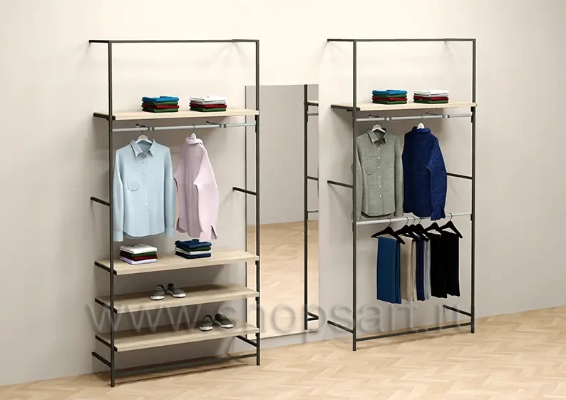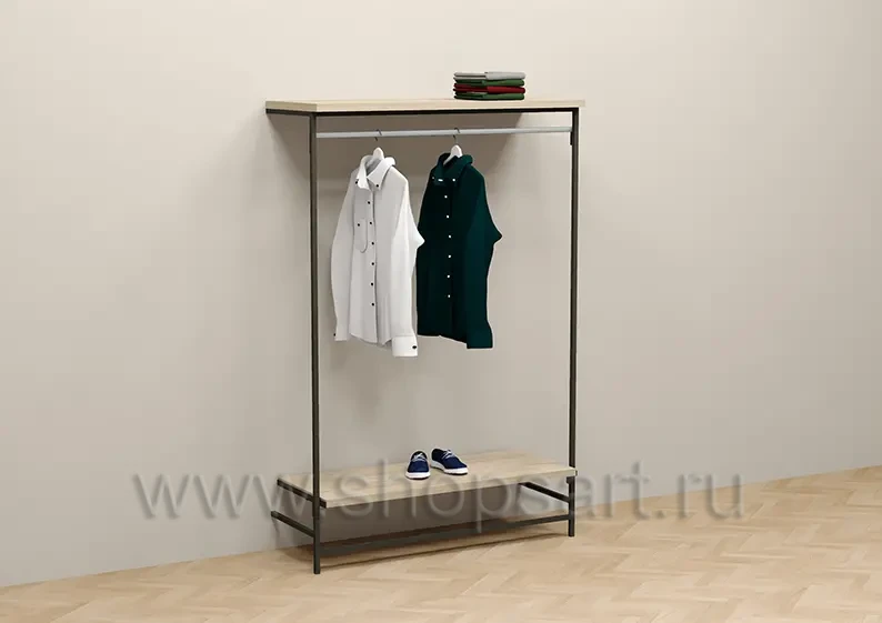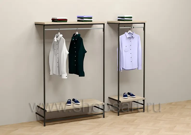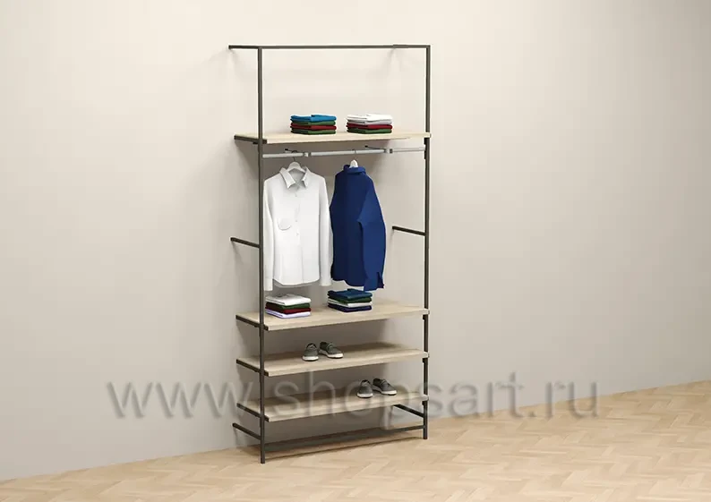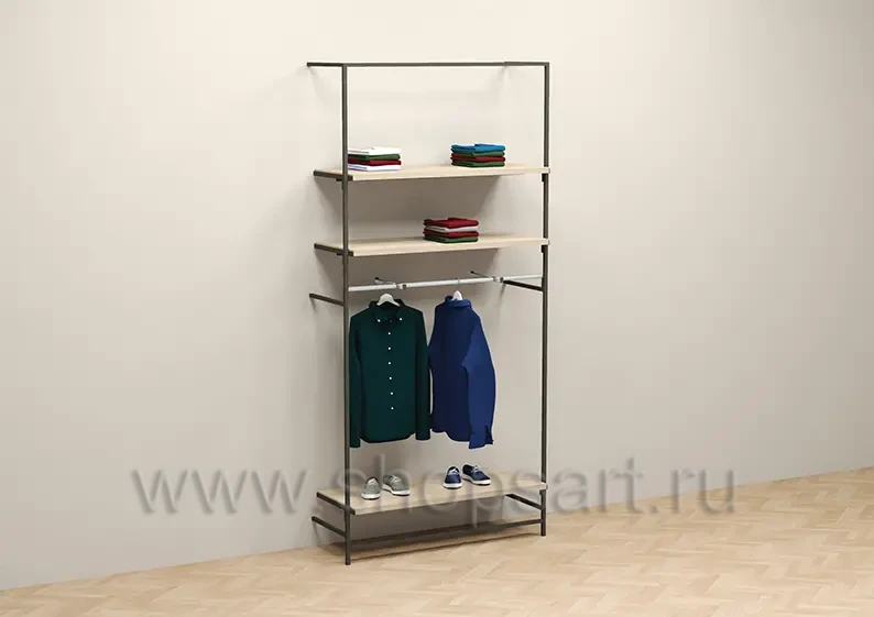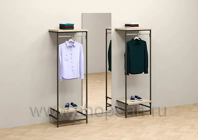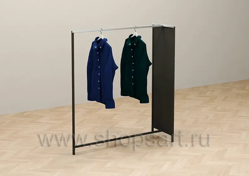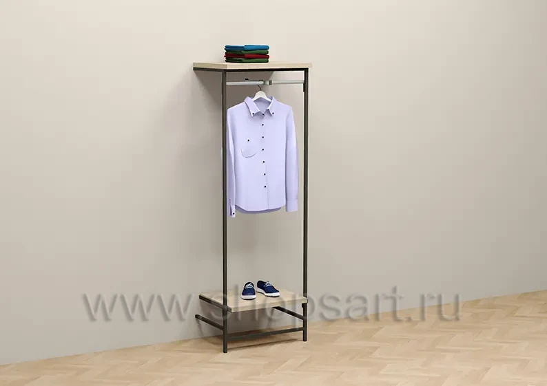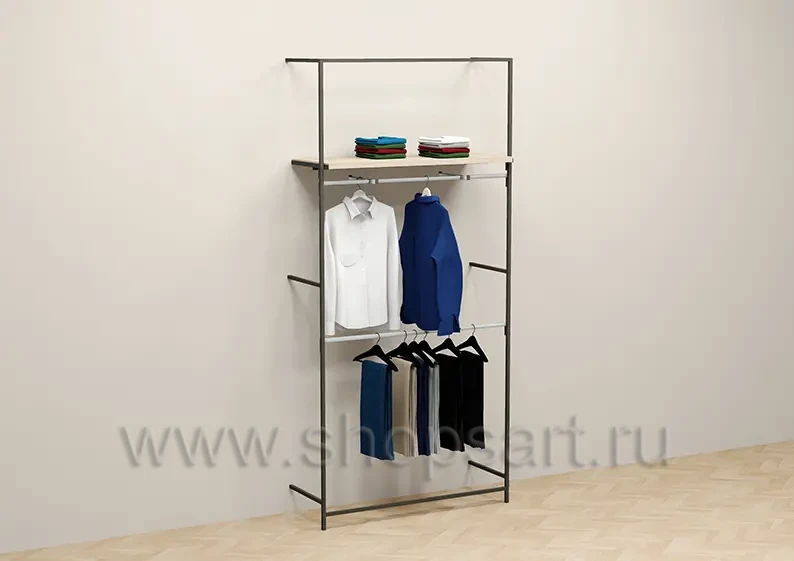 Торговый стеллаж оснащён кронштейнами для демонстрации рубашек и брюк, в верхней части установлена полочка для одежды из трикотажа. Каркас выполнен из металлической квадратной трубы с перфорацией 20*20 мм и с покрытием порошковой краской: цвет серый по RAL 7022, матовый. Все навесные кронштейны взаимозаменяемы и регулируются по высоте.