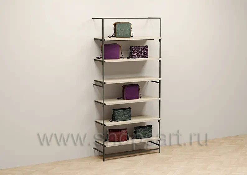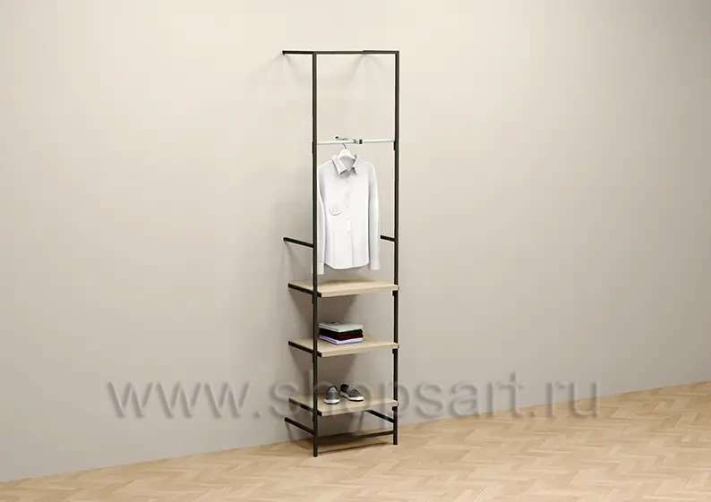 Стеллаж с полками с креплением к стене выполнен из металлической квадратной трубы 20*20 мм с перфорацией и с покрытием порошковой краской: цвет серый по RAL 7022, матовый. Торговый стеллаж оснащен прямым кронштейном для одежды и полочками, на которых можно представить одежду из трикотажа или образцы обуви.