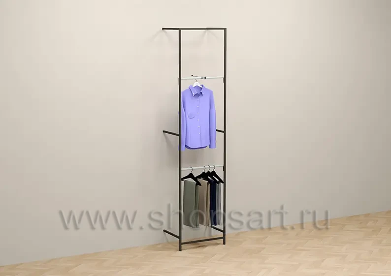 Стеллаж узкий, для одежды, выполнен с креплением к стене из металлической квадратной трубы 20*20 мм с перфорацией и с покрытием порошковой краской: цвет серый по RAL 7022, матовый. Торговая секция оснащена прямым кронштейном для одежды, в нижней части кронштейн для навески брюк. Все навесные кронштейны регулируются по высоте.