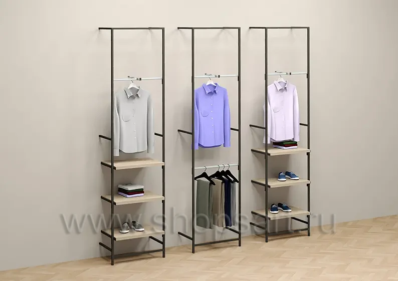 Блок торговых стеллажей, состоит из трех открытых секций с креплением к стене. Каркас изделий выполнен из металлической квадратной трубы 20*20 мм с перфорацией и с покрытием порошковой краской цвет серый по RAL 7022 матовый. Торговые секции оснащены кронштейнами для демонстрации рубашек, брюк и полочками для выкладки одежды или обуви.