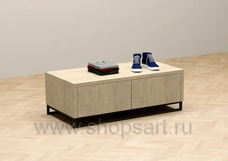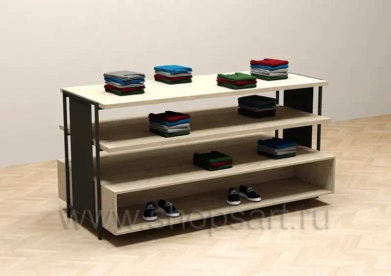 Демонстрационный стол состоит из открытых секций с полками, на которых можно представить обувь или одежду из трикотажа. Используется при оформлении островных конструкций в торговом зале. Боковые стенки стеллажа выполнены из металлического листа с покрытием порошковой краской. Каркас выполнен из металлической квадратной трубы с покрытием порошковой краской. Полочки для выкладки товара – ЛДСП 16 мм, цвет матовый «под дерево».