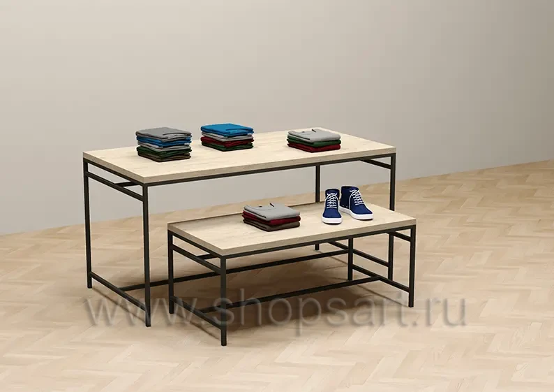 Комплект демонстрационных столиков, предназначен для выкладки одежды из трикотажа или обуви, устанавливается в центральной части магазина или используется при оформлении торговых витрин. Каркас подстолья выполнен из металлической квадратной трубы 20*20 мм с покрытием порошковой краской – цвет серый по RAL 7022, матовый. Столешницы для выкладки товара выполнены из матового ЛДСП 32 мм.