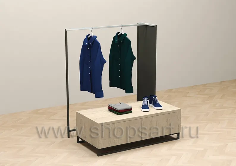 Островная стойка с накопителем устанавливается в центральной части торгового зала, используется для демонстрации одежды и выкладки товара. Каркас торговой стойки выполнен из металлической квадратной трубы 20*20 мм с покрытием порошковой краской. Накопитель выполнен из матового ЛДСП 16 мм, цвет «под дерево».