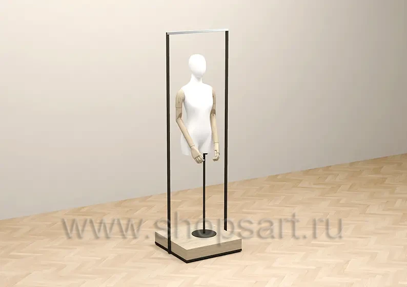Островная стойка с подиумом устанавливается в центральной части торгового зала или в витрине магазина, используется для демонстрации одежды. Торговая стойка выполнена из металлической квадратной трубы 20*20 мм с покрытием порошковой краской: цвет серый по RAL 7022, матовый. В нижней части островной стойки смонтирован подиум из матового ЛДСП 16 мм «Дуб Приморский сатиновый» K081 PW «Кроношпан».