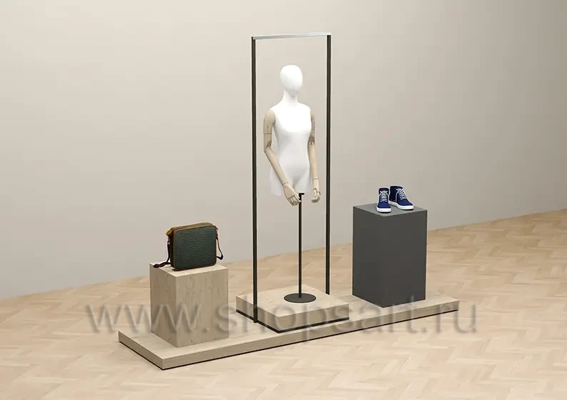 Торговый остров используется при оформлении витрины магазина или центральной части магазина или бутика, состоит из демонстрационных кубов для демонстрации обуви, сумок и островной стойки для демонстрации одежды или манекена. Вся композиция торгового оборудования устанавливается на демонстрационный подиум.