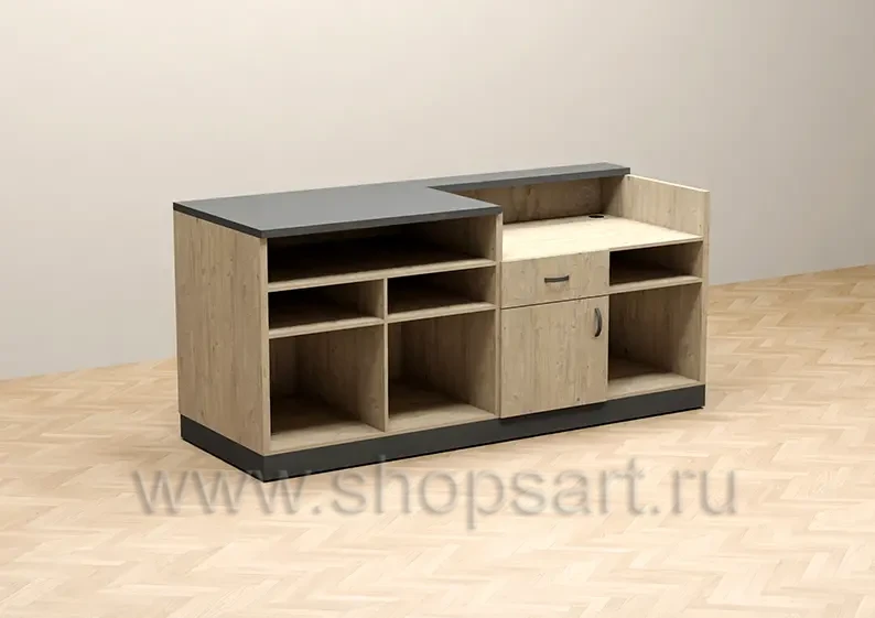 Стол кассира, состоит из рабочего места продавца и зоны для упаковки покупок. Внутренне наполнение кассового стола оснащено выдвижным ящиком, закрытой тумбой с распашной дверкой с запиранием на ключ, имеются открытые секции с полочками для хранения упаковки. Изделие выполнено из матового ЛДСП 16 мм, столешница и цоколь цвет серый, матовый.